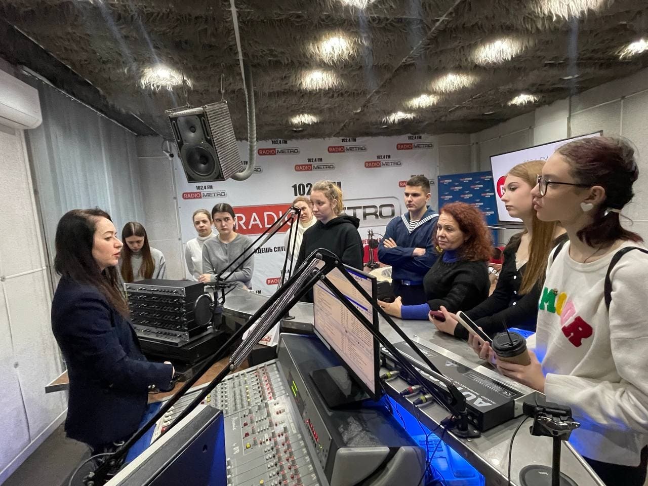 Юные журналисты объединения «Мультимедийная журналистика 2.0» приняли участие в редакционной летучке лаборатории творческих проектов «Я.Медиа». Тему «Современное радио» обсуждали на одной из крупнейших радиостанций Петербурга «МЕТРО» 102.4 FM. Генеральный продюсер и программный директор Наталья Юдочкина провела экскурсию и объяснила, как работает редакция, где пишутся новости, откуда идут прямые эфиры.